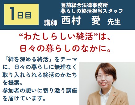 1部では、豊前市の弁護士事務所『豊前総合法律事務所』にお勤めの暮らしの終活担当スタッフの西村愛さんが、終活のことを分かりやすくお話ししていただけます。